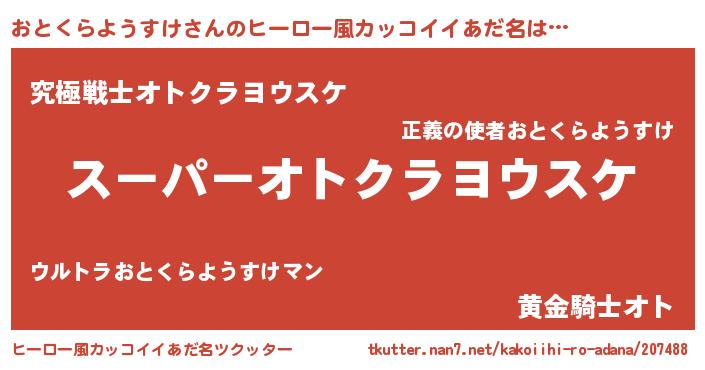 | 男性向けラノベタイトル風あだ名 | 『おとくらようすけに滅ぼされるだけの簡単なお仕事です』 |