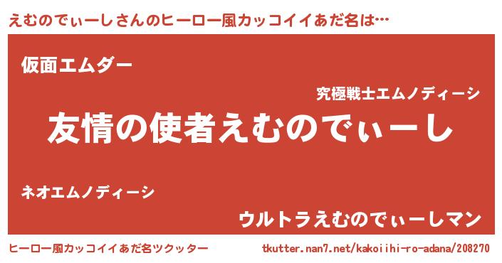 | 男性向けラノベタイトル風あだ名 | 『おまえをオタクにしてやるから、俺をえむのでぃーしにしてくれ! 』 |
