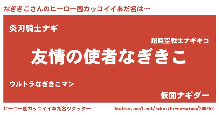 | 男性向けラノベタイトル風あだ名 | 『おまえをオタクにしてやるから、俺をなぎきこにしてくれ! 』 |