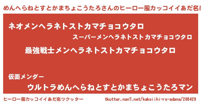 | 伝説のあだ名 | 『古文書に記された勇者めんへらねとすとかまちょこうたろ』 |