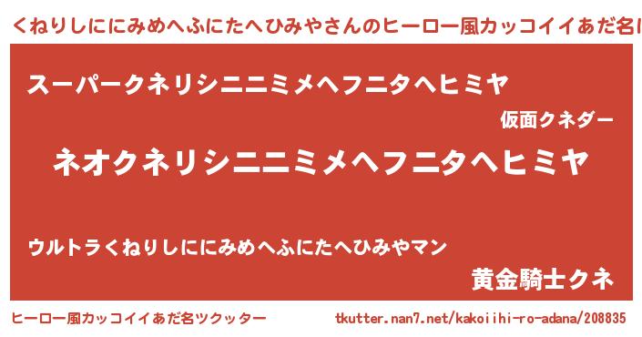| ヘコむあだ名 | 『くねりしににみめへふにたへひみや(笑)』 |