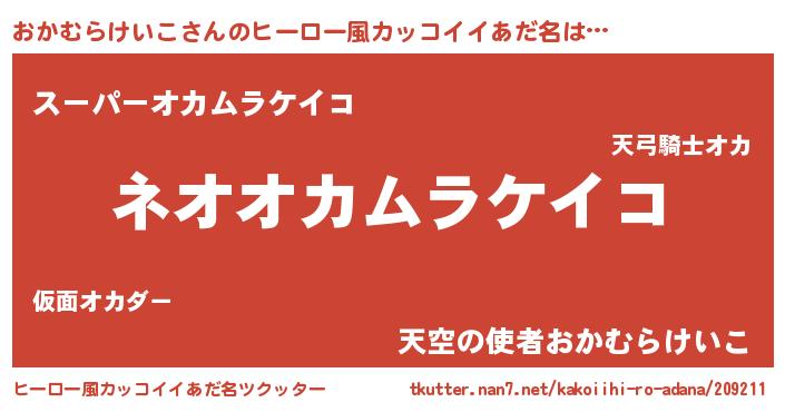 | 男性向けラノベタイトル風あだ名 | 『誰もが恐れるあのおかむらけいこが、ぼくの専属メイドになるようです。』 |