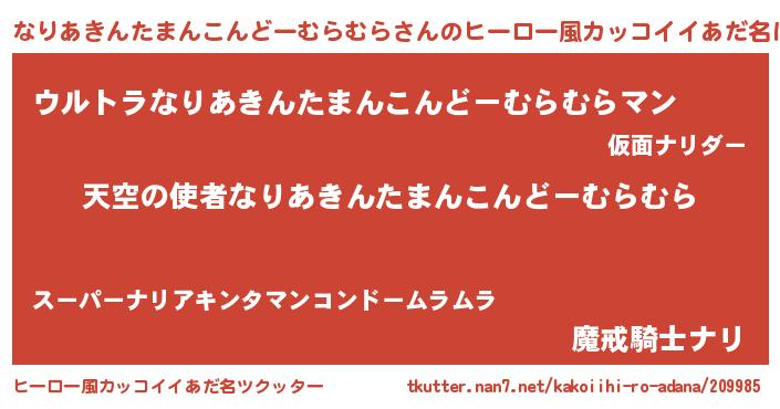 | 男性向けラノベタイトル風あだ名 | 『なりあきんたまんこんどーむらむら~年齢イコール彼女いない歴の魔法使い~』 |