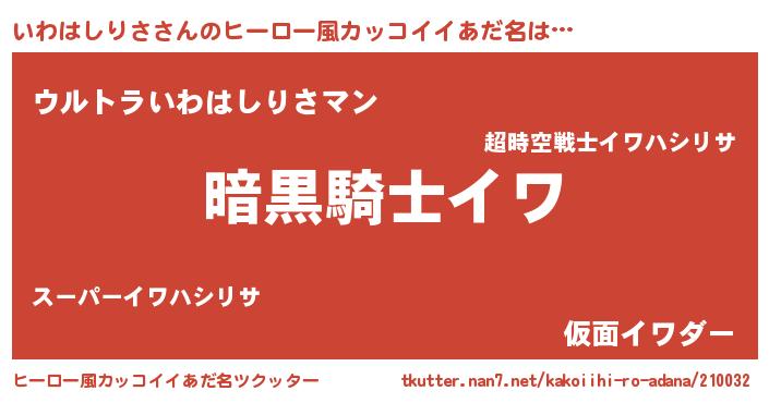 | 男性向けラノベタイトル風あだ名 | 『イワハシリサスレイヤー』 |