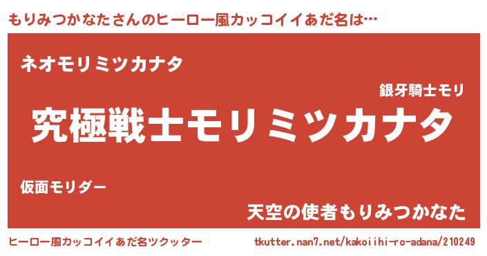 | 男性向けラノベタイトル風あだ名 | 『もりみつかなた~年齢イコール彼女いない歴の魔法使い~』 |