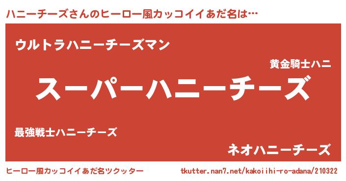 | 男性向けラノベタイトル風あだ名 | 『ハニーチーズに滅ぼされるだけの簡単なお仕事です』 |