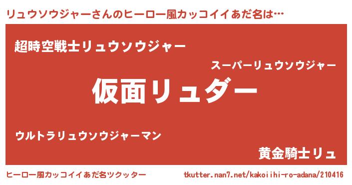 | 男性向けラノベタイトル風あだ名 | 『うちのリュウソウジャーが世界を掌握している!』 |