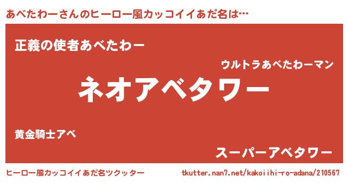 | 男性向けラノベタイトル風あだ名 | 『転生したらあべたわーだった件』 |