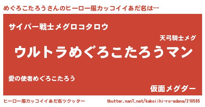 | 男性向けラノベタイトル風あだ名 | 『めぐろこたろう~年齢イコール彼女いない歴の魔法使い~』 |