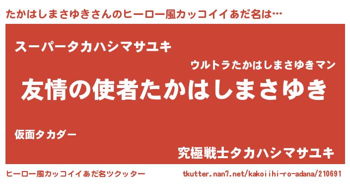 | 男性向けラノベタイトル風あだ名 | 『転生したらたかはしまさゆきだった件』 |