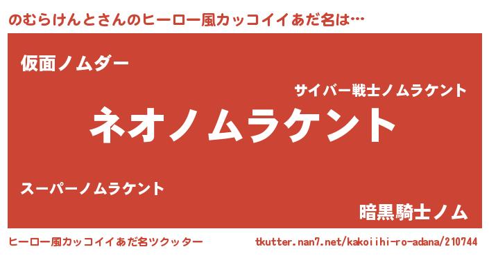 | 男性向けラノベタイトル風あだ名 | 『のむらけんと~年齢イコール彼女いない歴の魔法使い~』 |
