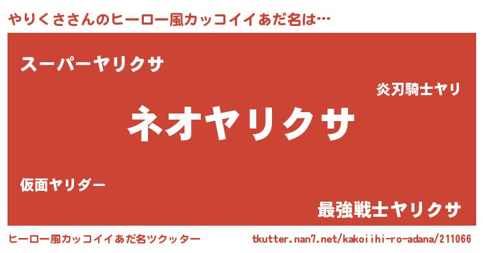 | 男性向けラノベタイトル風あだ名 | 『やりくさという概念が存在しない退屈な世界 』 |