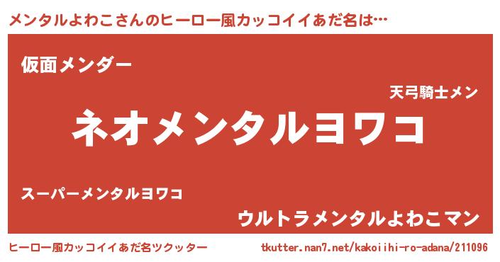 | 男性向けラノベタイトル風あだ名 | 『メンタルよわこという概念が存在しない退屈な世界 』 |