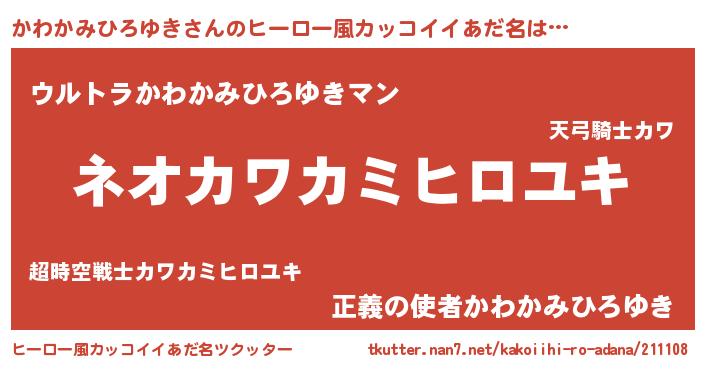 | 男性向けラノベタイトル風あだ名 | 『かわかみひろゆき~年齢イコール彼女いない歴の魔法使い~』 |