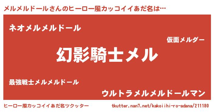 | 男性向けラノベタイトル風あだ名 | 『メルメルドールの嫁は女の子じゃないと思った?』 |