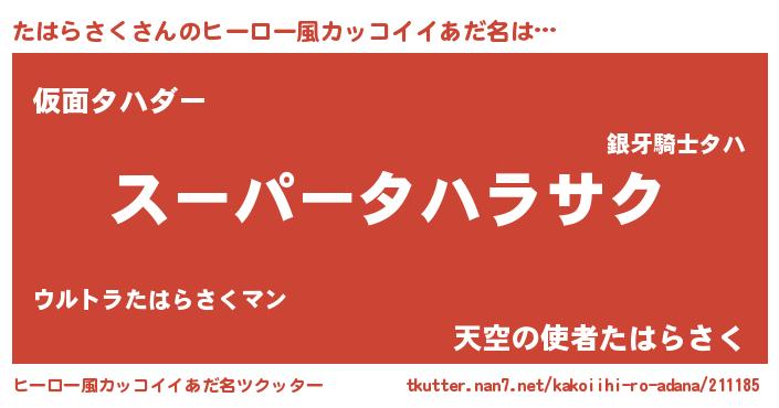 | 男性向けラノベタイトル風あだ名 | 『たはらさく~年齢イコール彼女いない歴の魔法使い~』 |