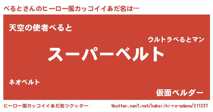| 男性向けラノベタイトル風あだ名 | 『べるとの憂鬱』『魔弾の王とべると』 |