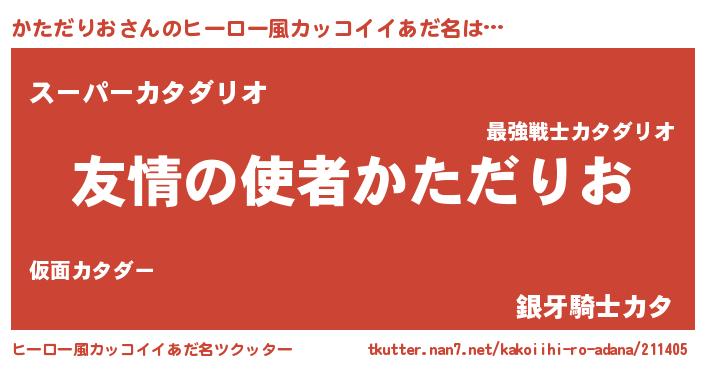 | 男性向けラノベタイトル風あだ名 | 『おまえをオタクにしてやるから、俺をかただりおにしてくれ! 』 |