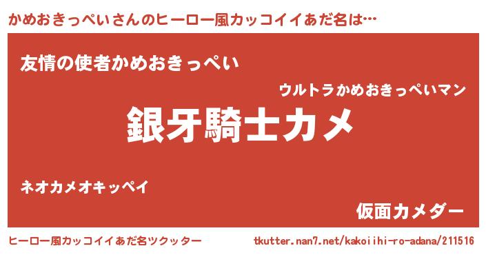 | 男性向けラノベタイトル風あだ名 | 『かめおきっぺいの嫁は女の子じゃないと思った?』 |