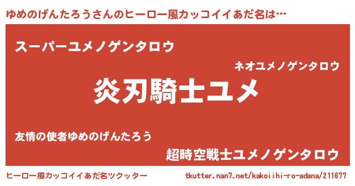 | 男性向けラノベタイトル風あだ名 | 『ゆめのげんたろうの嫁は女の子じゃないと思った?』 |