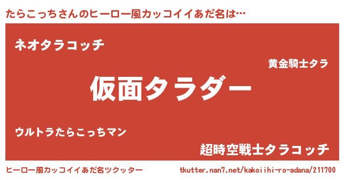 | 男性向けラノベタイトル風あだ名 | 『この素晴らしい世界にたらこっちを!』 |
