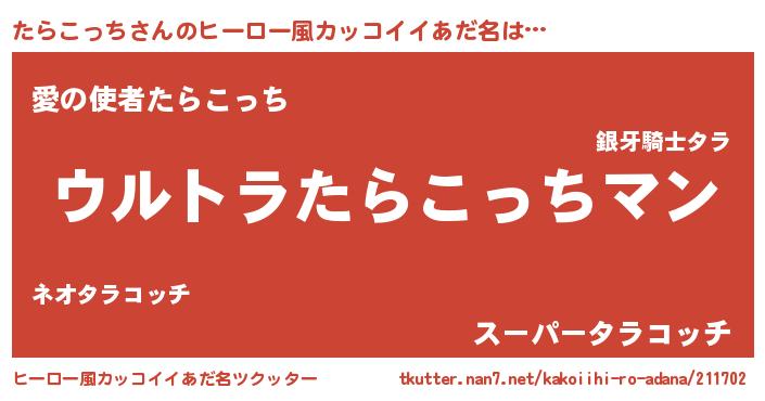 | 女子向けラノベタイトル風あだ名 | 『たらこっちの玉の輿計画!』 |