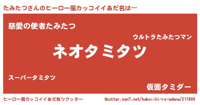 | 男性向けラノベタイトル風あだ名 | 『たみたつ~年齢イコール彼女いない歴の魔法使い~』 |