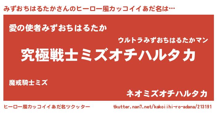 | 男性向けラノベタイトル風あだ名 | 『Re:みずおちはるたかから始める異世界生活』 |