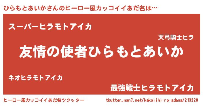 | 男性向けラノベタイトル風あだ名 | 『おまえをオタクにしてやるから、俺をひらもとあいかにしてくれ! 』 |