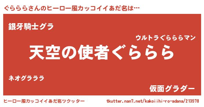 | 男性向けラノベタイトル風あだ名 | 『ぐららら~年齢イコール彼女いない歴の魔法使い~』 |