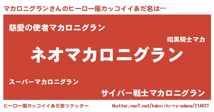 | 男性向けラノベタイトル風あだ名 | 『マカロニグラン~年齢イコール彼女いない歴の魔法使い~』 |