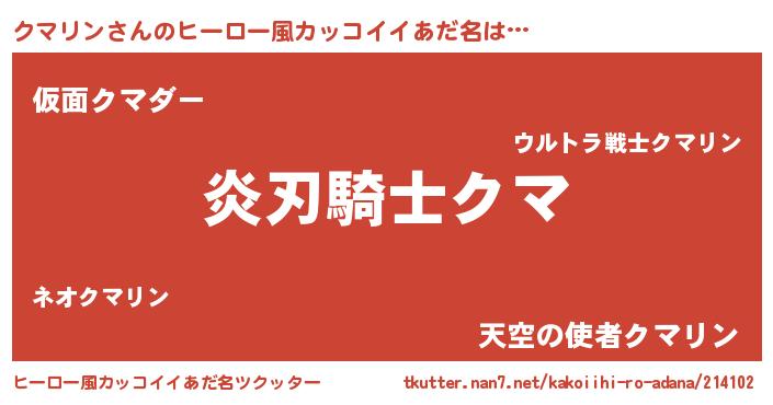 | 男性向けラノベタイトル風あだ名 | 『クマリンの嫁は女の子じゃないと思った?』 |