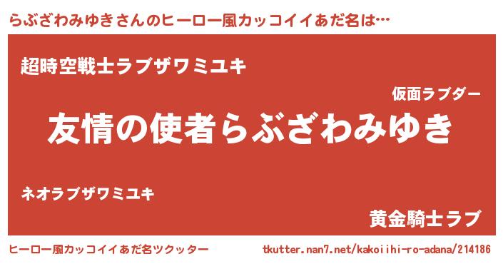 | 男性向けラノベタイトル風あだ名 | 『おまえをオタクにしてやるから、俺をらぶざわみゆきにしてくれ! 』 |