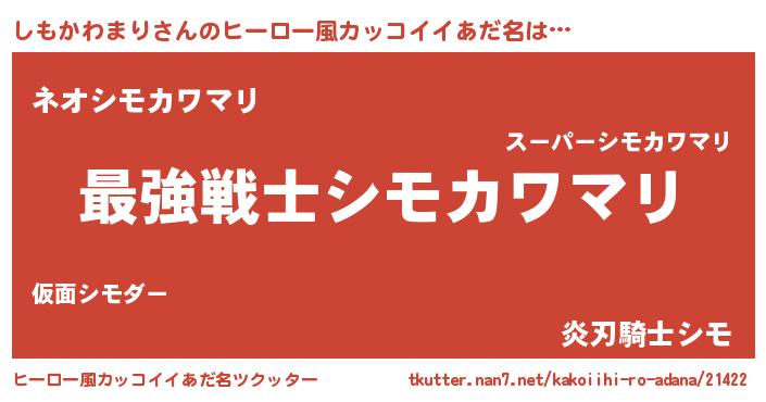 | 男性向けラノベタイトル風あだ名 | 『うちのしもかわまりが世界を掌握している!』 |