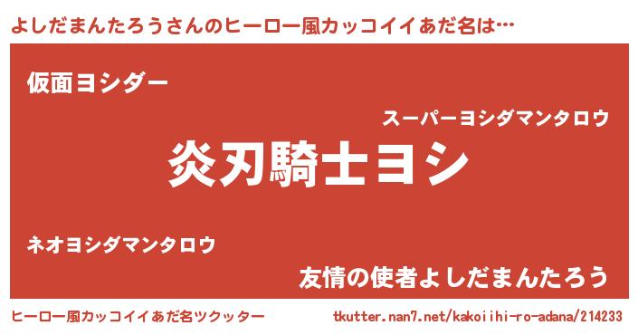 | 男性向けラノベタイトル風あだ名 | 『うちのよしだまんたろうが世界を掌握している!』 |