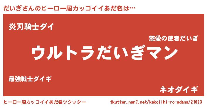| 男性向けラノベタイトル風あだ名 | 『だいぎ~年齢イコール彼女いない歴の魔法使い~』 |