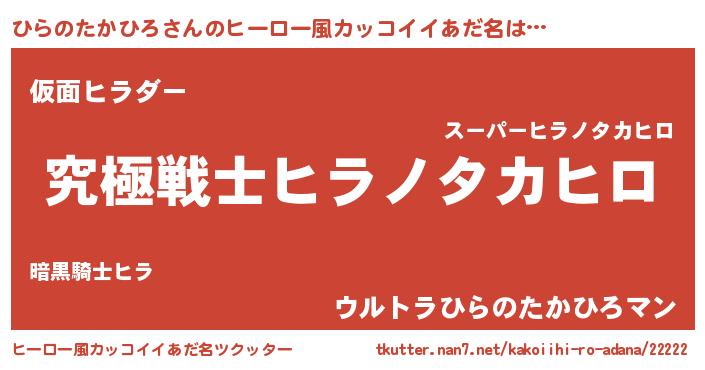 | 男性向けラノベタイトル風あだ名 | 『Re:ひらのたかひろから始める異世界生活』 |