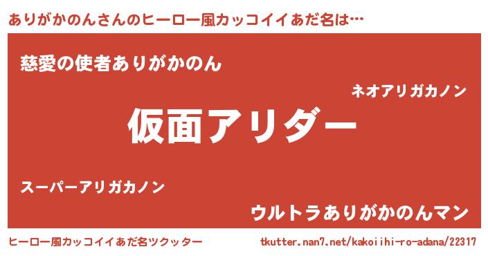 | 女子向けラノベタイトル風あだ名 | 『ありがかのんの玉の輿計画!』 |