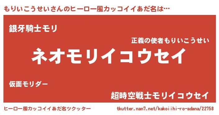 | 男性向けラノベタイトル風あだ名 | 『もりいこうせい~年齢イコール彼女いない歴の魔法使い~』 |