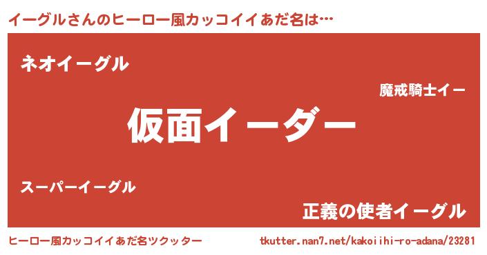 | 男性向けラノベタイトル風あだ名 | 『イーグル~年齢イコール彼女いない歴の魔法使い~』 |