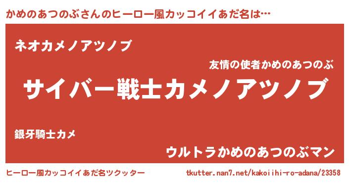 | 男性向けラノベタイトル風あだ名 | 『Re:かめのあつのぶから始める異世界生活』 |