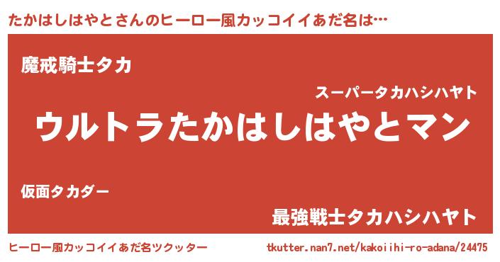 | 男性向けラノベタイトル風あだ名 | 『たかはしはやと~年齢イコール彼女いない歴の魔法使い~』 |