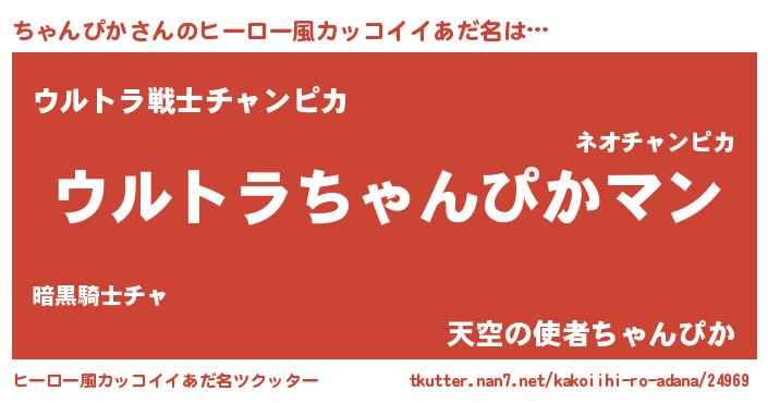 | 男性向けラノベタイトル風あだ名 | 『ちゃんぴか~年齢イコール彼女いない歴の魔法使い~』 |