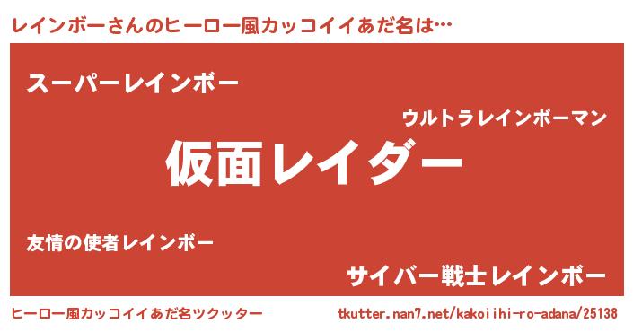 | 男性向けラノベタイトル風あだ名 | 『この素晴らしい世界にレインボーを!』 |