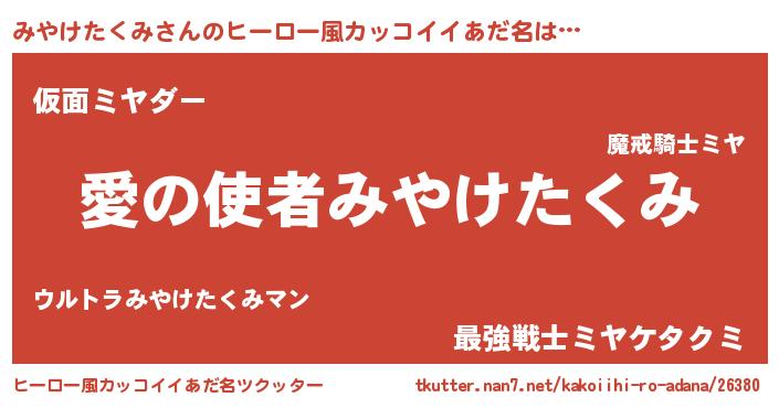 | 女子向けラノベタイトル風あだ名 | 『みやけたくみの玉の輿計画!』 |