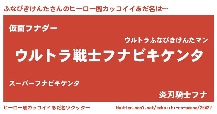 | 男性向けラノベタイトル風あだ名 | 『転生したらふなびきけんただった件』 |