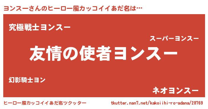 | 男性向けラノベタイトル風あだ名 | 『おまえをオタクにしてやるから、俺をヨンスーにしてくれ! 』 |