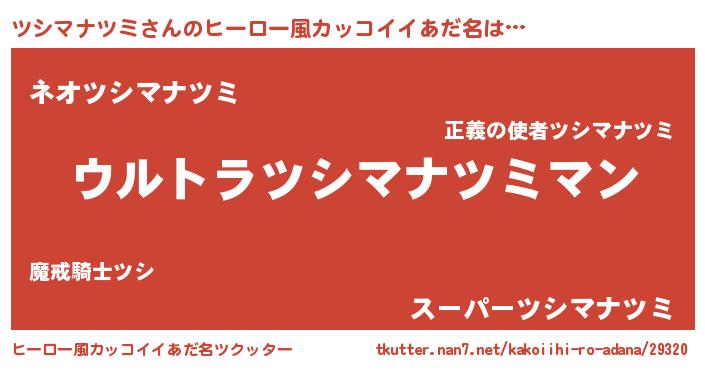 | 男性向けラノベタイトル風あだ名 | 『ツシマナツミ~年齢イコール彼女いない歴の魔法使い~』 |