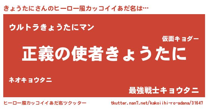 | 男性向けラノベタイトル風あだ名 | 『おまえをオタクにしてやるから、俺をきょうたににしてくれ! 』 |