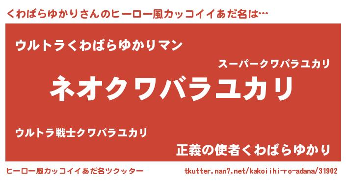 | 男性向けラノベタイトル風あだ名 | 『くわばらゆかりという概念が存在しない退屈な世界 』 |